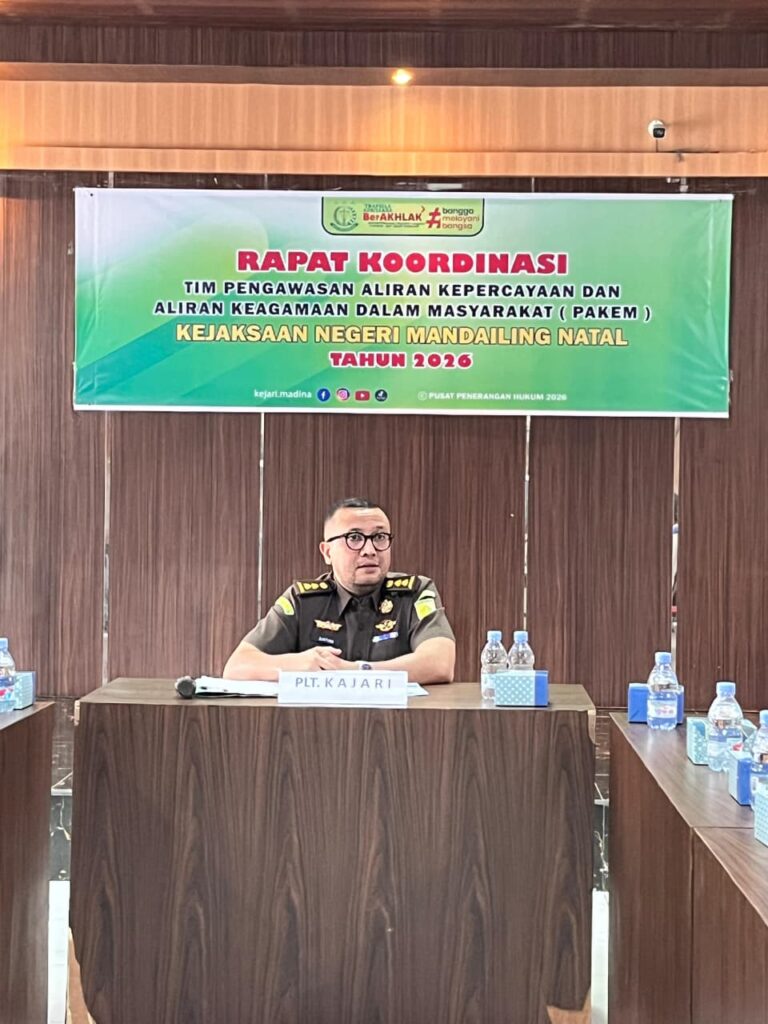 Panyabungan, Rabu 22 april 2026 – Kejaksaan Negeri Mandailing Natal melalui Bidang Intelijen menggelar Rapat Koordinasi Tim Pengawasan Aliran Kepercayaan dan Aliran Keagamaan dalam Masyarakat (PAKEM) Tahun 2026, bertempat di Aula Kejaksaan Negeri Mandailing Natal.